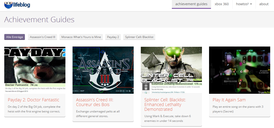 [headline tag='h3']Neues Theme[/headline]mit viele neuen Funktionen. Unter anderem habe ich eine Achievement Guides Seite erstellt, wo ich meine TA Guides poste, ohne das sie auf dem Blogindex auftauchen. Muss nach und nach mal die alten BeitrÁ¤ge auf das neue Design anpasssen...